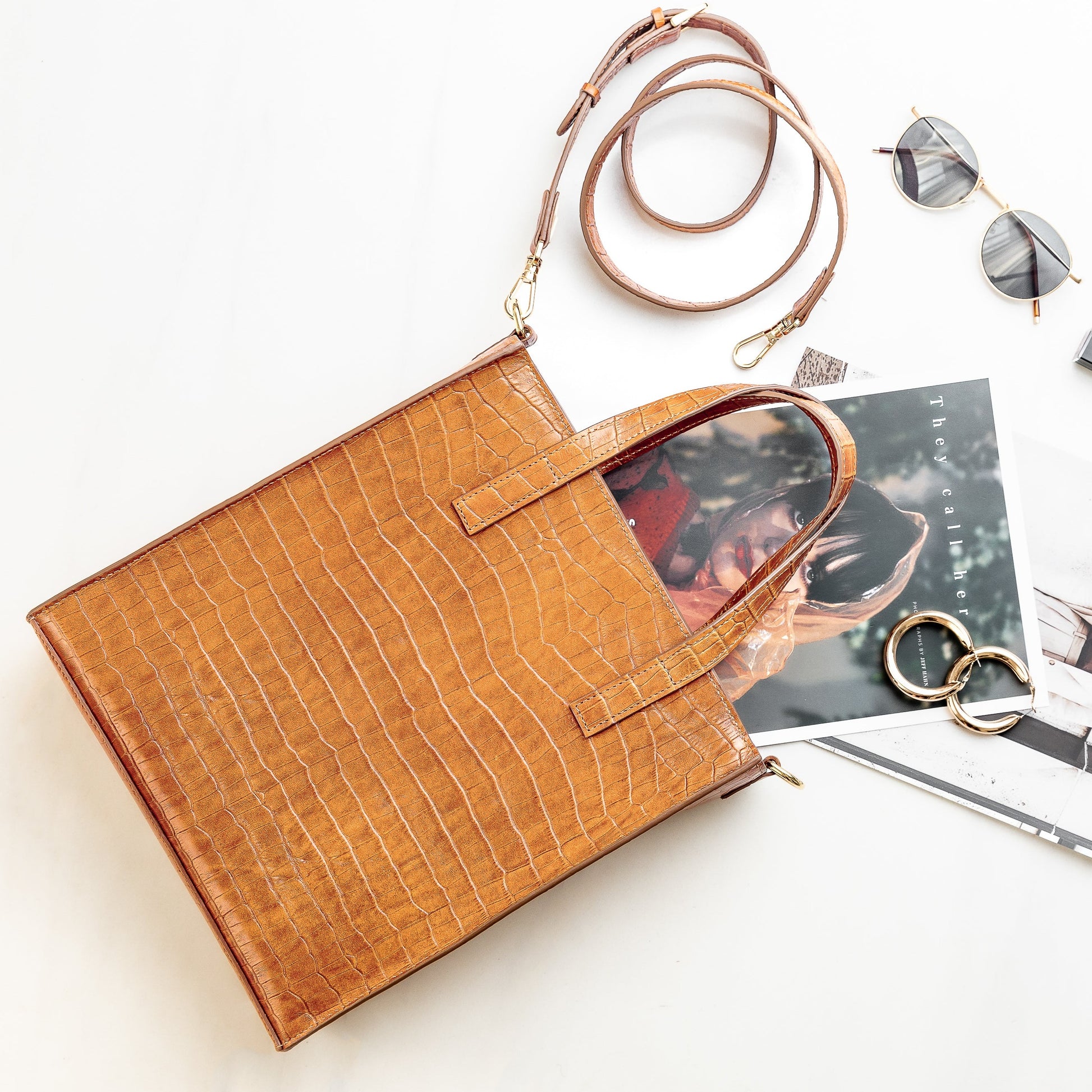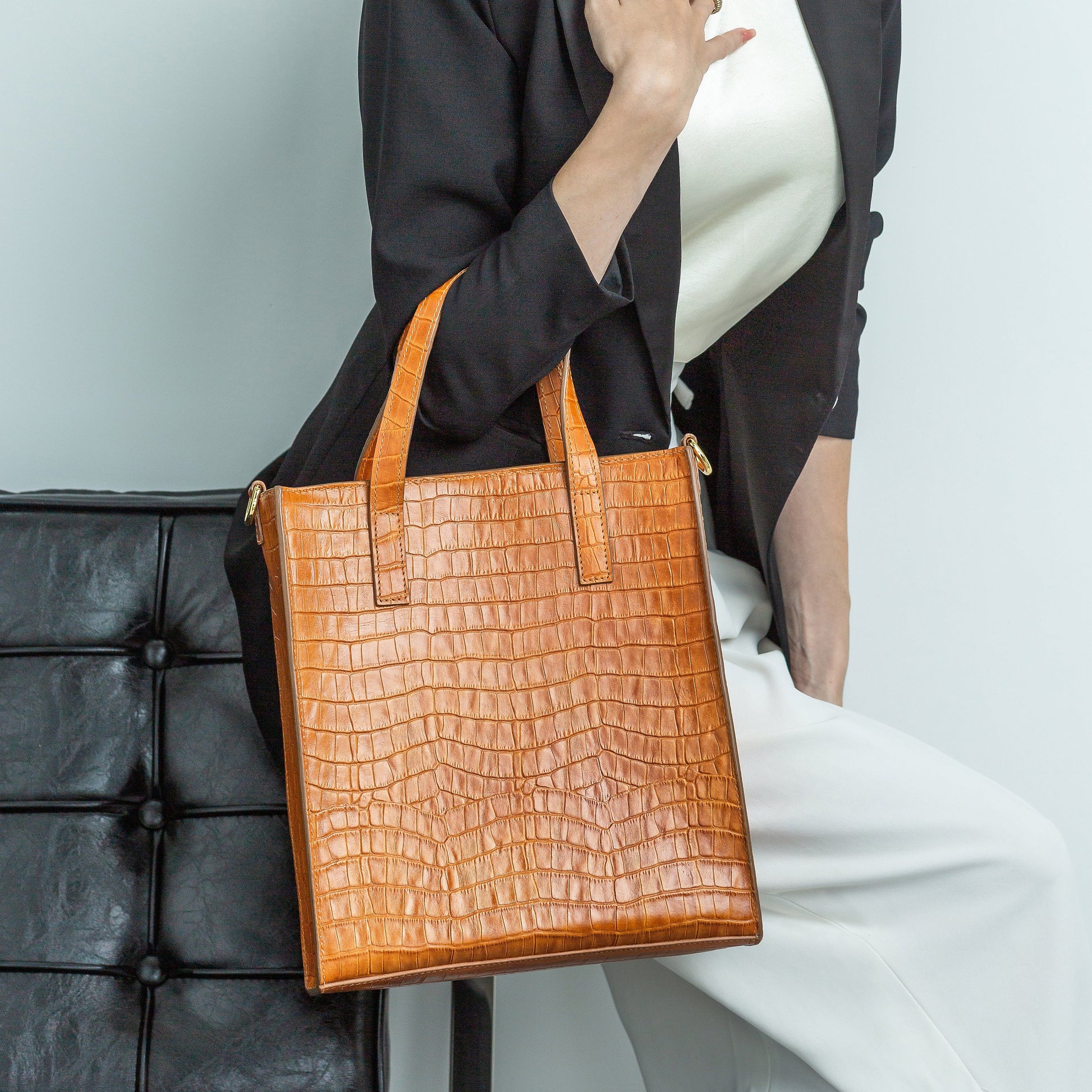 Made from high-quality croc embossed leather, it offers both style and durability. With its medium size and rectangular shape, it can easily hold your tablet or iPad, documents, and personal items. The interior is soft pig leather, with ample storage space and multiple compartments for easy organization. The top handle and extra cross body strap provide versatility and convenience. Whether you're heading to work or running errands, the Lily bag is a reliable and stylish choice for any occasion.