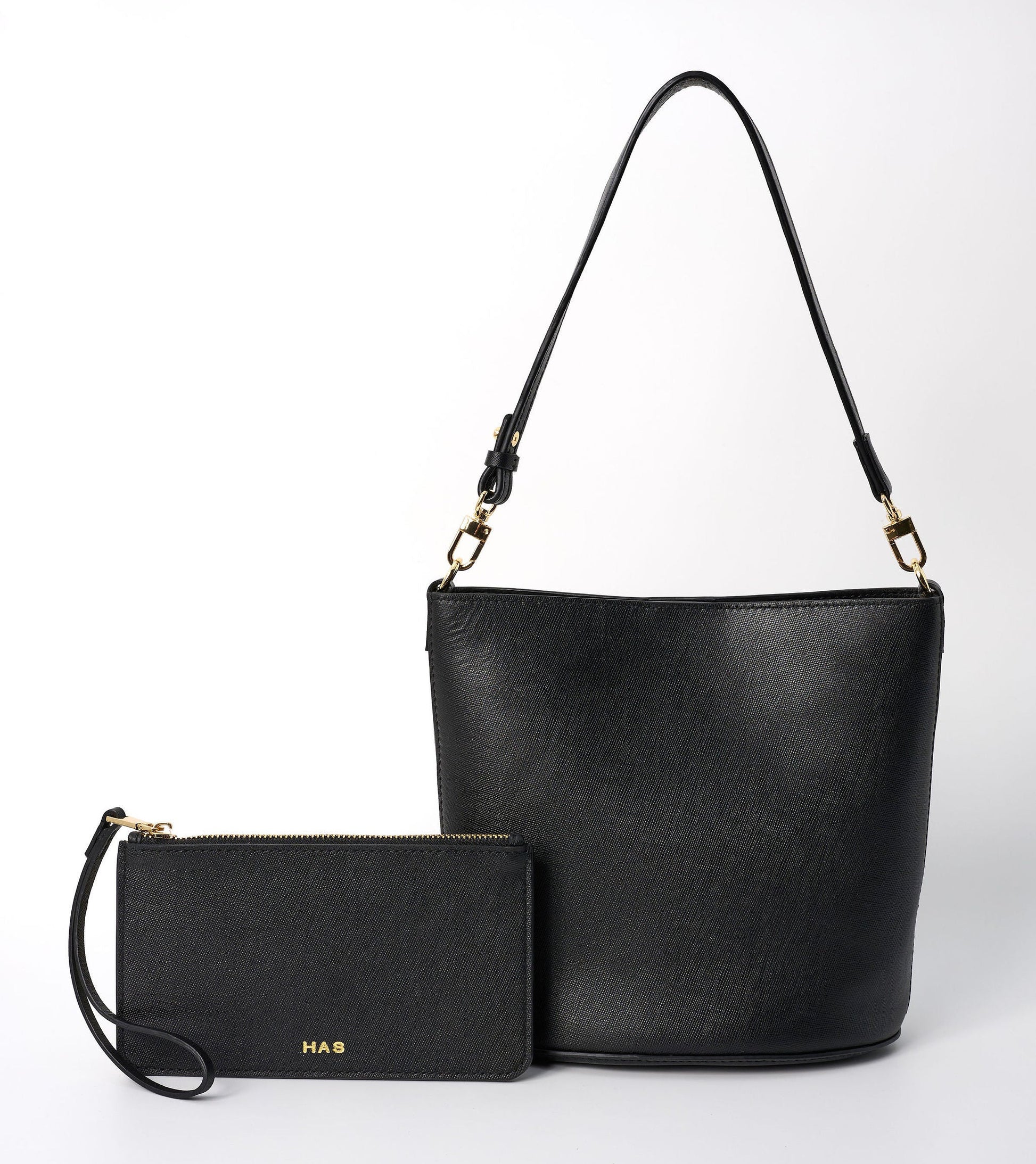 The bucket silhouette offers generous space for daily essentials, while the matching leather pouch keeps smaller items organized and within reach. The understated black finish makes it easy to wear from day to evening.
